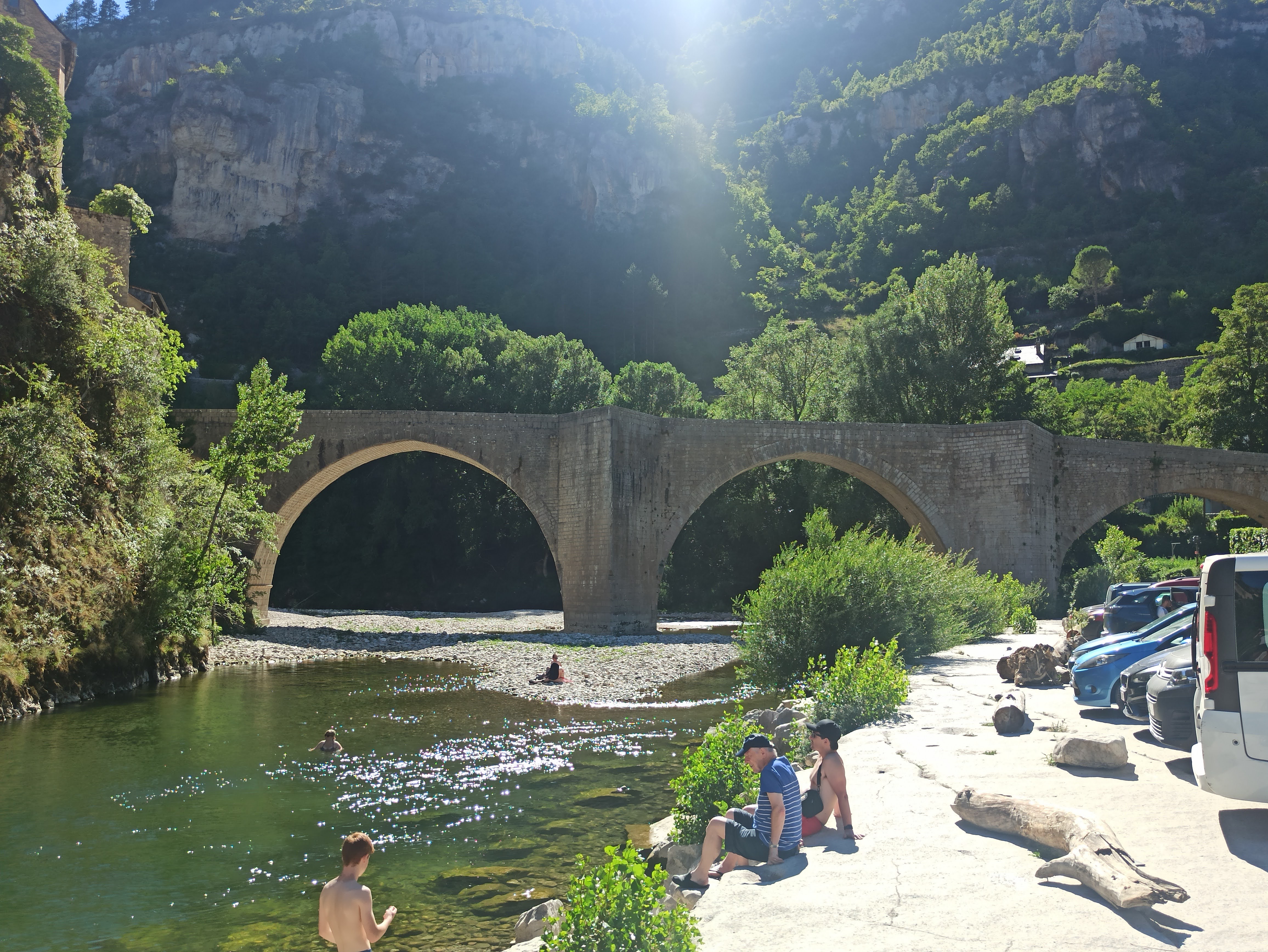Parking, également pour camping-cars, au bord du Tarn, au centre de Ste Enimie